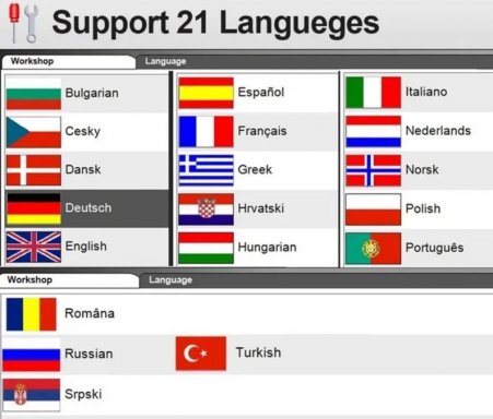 Netherlands (NL), English (GB), English (US), French (FR), German (DE), Spanish (ES), Russian (RU), Greek (GR), Danish (DK), Croatian (HR), Italian (I), Hungarian (HU), Polish (PL), Portugal (PT), Romanian (RO), Slovenian (SLO), Finish (FI), Swedish (SW), Turkish (TR), Czech (CZ), Japanese (JP), Chinese (CN), Korean (KO).